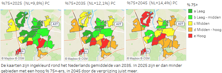 - In 2035 worden al meer gebieden geel, oranje of rood, dus een bovengemiddeld % 75+-ers.